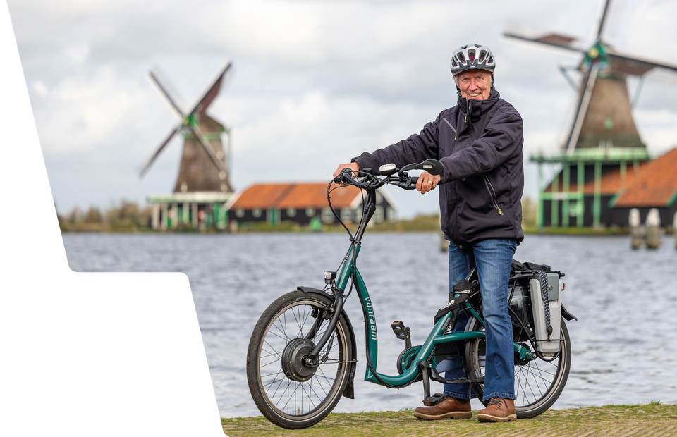 Die topconditie is niet altijd vanzelfsprekend geweest. In het verleden heeft hij uitgebreide gehoorproblematiek gehad, wat invloed heeft op zijn evenwicht en stabiliteit. Twintig jaar geleden kreeg hij daarom een speciaal hoortoestel dat is verankerd op z’n schedel. Maar daarmee waren de balansproblemen niet opgelost. “Ik ging steeds onderuit”, legt Harry uit. “Op een standaard fiets raak je alleen met je tenen de grond, niet met je hele voet. Fietsen was niet meer te doen.”